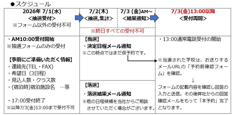 ・落選の際、抽選受付日の翌日以降(7/2~3)に別途日程のご相談をさせていただく場合がございます。