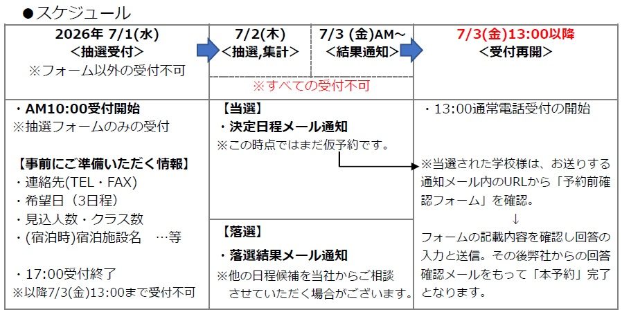 ・落選の際、抽選受付日の翌日以降(7/2~3)に別途日程のご相談をさせていただく場合がございます。